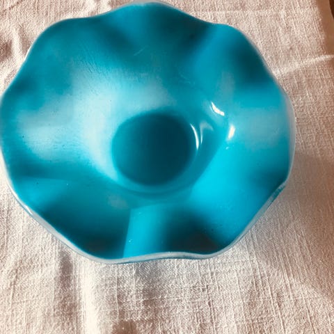 Flot tyrkis glas skål på fod, kan bruges til dessert, guf eller hvad man nu har lyst til, den er i pæn stand, den er 10 cm høj og 10 cm i omkredse oppe i selve glasset.