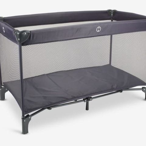Sammenklappelig børneseng til brug på rejse, i sommehus eller besøg ved bedsteforældre. Sort stof på metalstel. Brugt ganske lidt så i pæn stand.