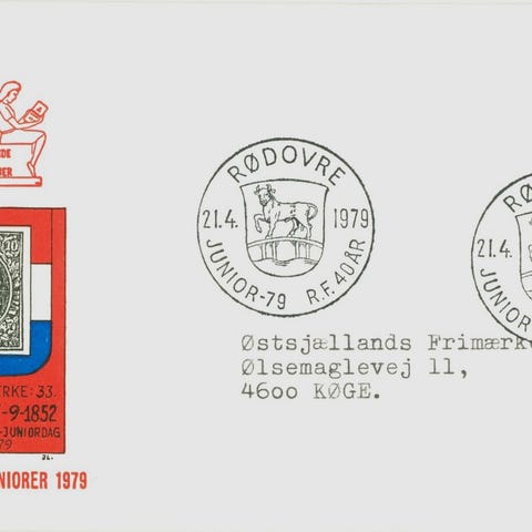 Dekorativ udstillingskuvert fra Ung Filateli - Samarbejdende Junior Samlerklubbers lands-junior-udstilling. Flot stemplet København K 12.4.1958.