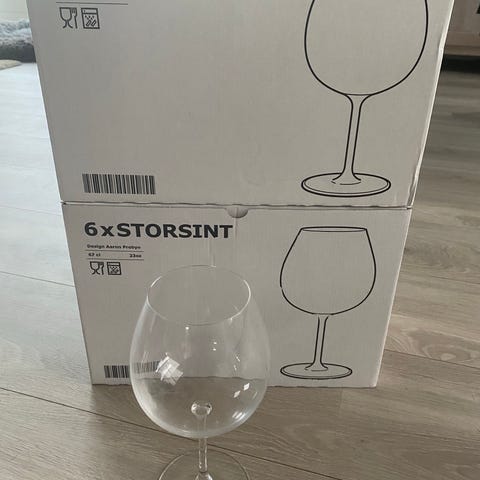 IKEA STORSINT rødvinsglas i klar glas. Sættet indeholder 6 glas med en højde på ca. 22 cm. Glassene er designet til servering af rødvin og har en stilfuld og enkel form.