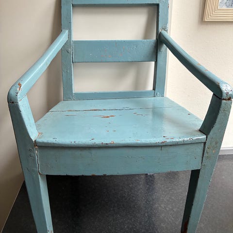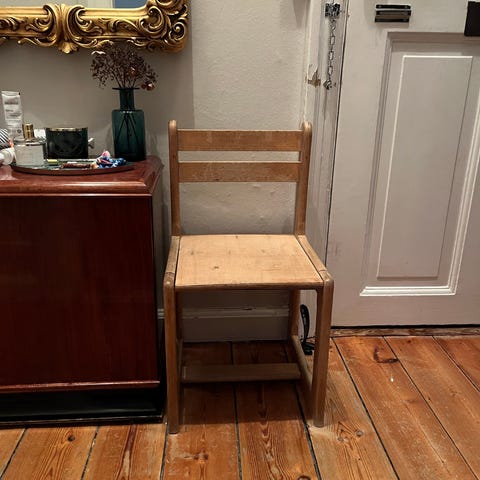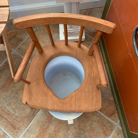 Sød rød træstol med potte der kan tages ud. Antik men velholdt.