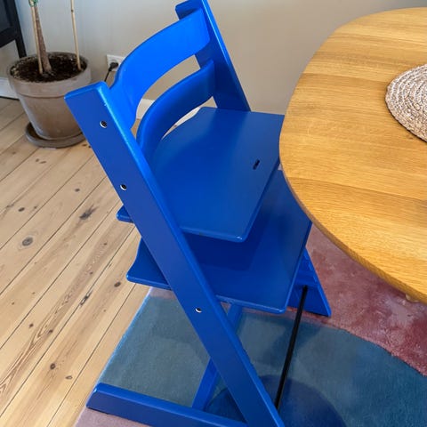 Stokke Tripp Trapp højstol i sort med trædetaljer og gråt sædehynde. Højstolen er designet til børn og kan justeres for at give komfort og støtte. Materialerne inkluderer træ og plast med en blød, grå stofhynde til ekstra siddekomfort.