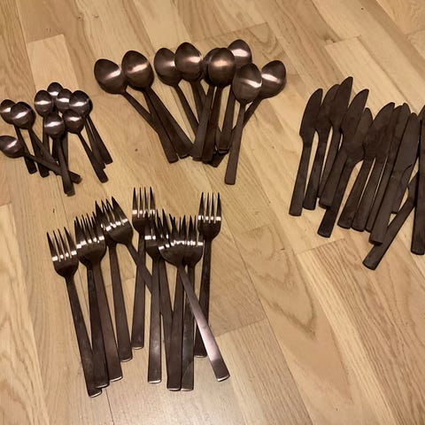 8 knive, 2 spiseskeer og en gaffel