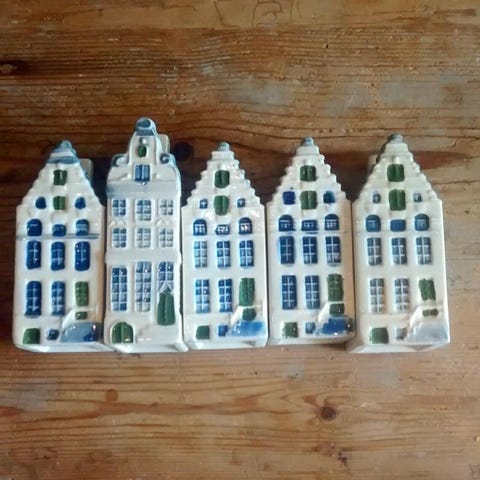 Sæt bestående af 4 dekorative træhuse i miniatureformat. Husene har forskellige former og farver, herunder sort og naturtræfarvet med detaljer som stjerner og blå tage. Velegnet til brug som pynt eller samlerobjekter.