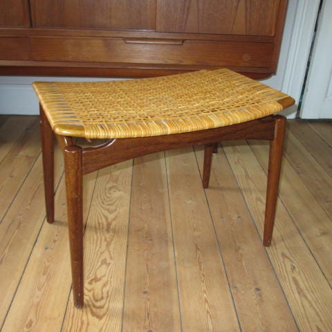 Skammel med flet designet af Sigfred Omann for Ølholm Møbelfabrik. Udført i eg og sjeneflet og med sko i messing.