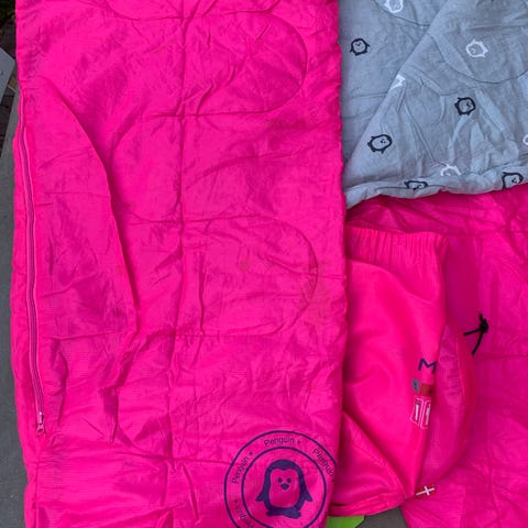 Børnesovepose med en længde på 130 cm, designet til 2-3 sæsoner. Soveposen har en skal af vandafvisende polyester, en indre fyldning af hollowfibre og en komforttemperatur på 10°C. Farven er blå og sort. Den til børn og stort set ikke brugt. Se flere detaljer på billederne.
