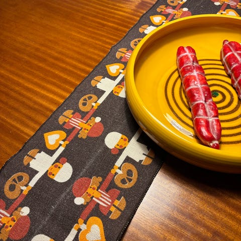 Løber og serviet, Södahl, Bordløber og tilhørende serviet til brødkurv. fra 1990erne. Orange tryk med grønne og gule dekorationer. Bomuld.