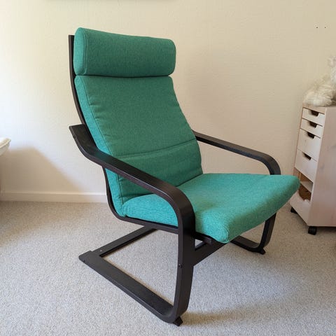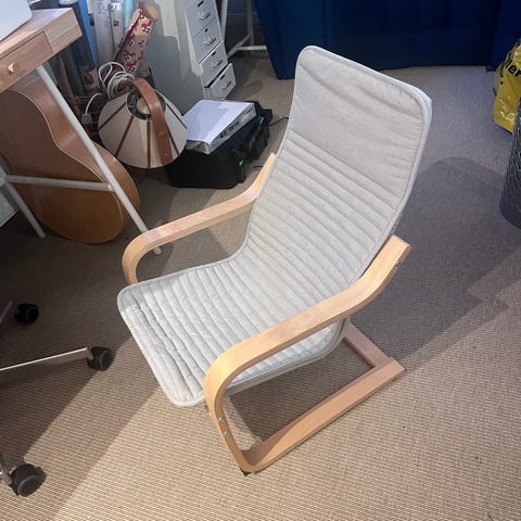 Stolen hedder IKEA POÄNG og har vaskbar, aftagelig hynde. Den er netop blevet vasket. Der er dog stadig lidt småpletter i siddet, men det er jo også en brugt stol. Alligevel er stolen intakt.