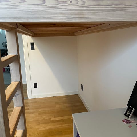 Trappen er der lidt klistermærker på. Den er pillet ned, da der er en ny seng nedenunder.
