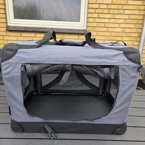 Sammenklappelig Transporttaske/bur i grå og sort materiale str. S (længde 50 cm., højde 34 cm, bredde 34 cm.) brugt få gange. Kan klappes sammen. Nypris 350 kr.