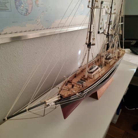 Super flot modelskib i gode matrialer( længde ca. 110 høj ca. 80cm) - har været hos en gammel mand , så snorer er mørnet samt en masse tilbehør der skal sættes på rette plads. Man kan google billedet, så kan man se hvadfor et skib det er og pris. Jeg har ikke kunne finde herhjemme denne model til salg. Bud velkommem