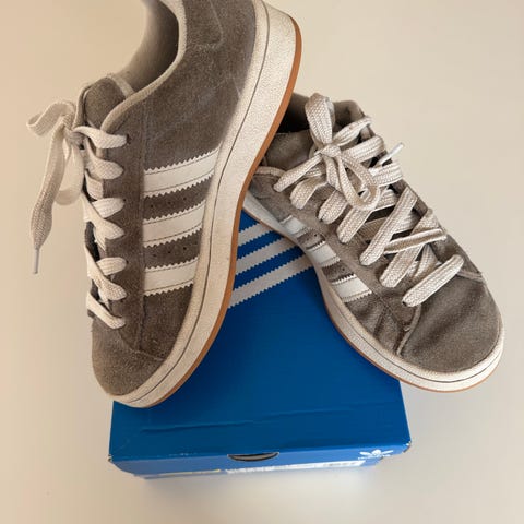 Blå Adidas Campus med tofarvet snørrebånd. Kun brugt indendørs til 3 danseshows af 3 min. varighed, så stort set som nye. Lidt fnuller fra sokker inde i skoen og Adidas logo inde i skoen er lidt slidt. Str 36 2/3. Prisen er fast, da nypris var lige under 1000 kr.