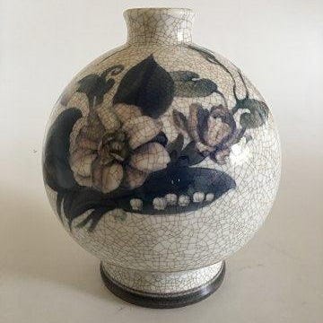 Meget sjældent glasurstykke af Jo Hahn Locher for Bing & Grøndahl. Hun arbejdede tæt sammen med Axel Salto, hvilket ses tydeligt i sildebens-designet. Salto udviklede den riflede stil på Bing & Grøndahl i begyndelsen af 1920’erne. Højde 13 cm. Diameter 12 cm.
