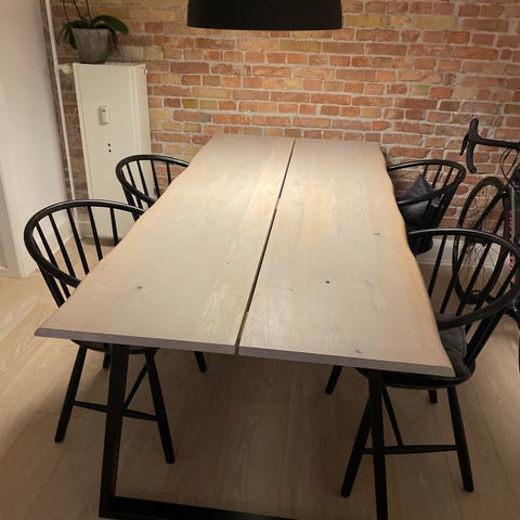 Smukt plankebord med 3 brede planker i massiv, naturolieret eg. Bordet har elegante, skrå ben i sort pulverlakeret metal, som giver et moderne og stilrent udtryk.