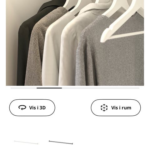 Sælges: 2 stk. KOMPLEMENT garderobestænger i hvid. Passer til IKEA PAX skabe og er en udgået model. Garderobestængerne har udtræk og gør det muligt at hænge tøj, så det vender ud mod dig – perfekt til skabe med kun 35 cm dybde. Solid konstruktion, der matcher PAX garderobestel og giver et indbygget og stilrent udseende. Kan afhentes på 2000 Frederiksberg.