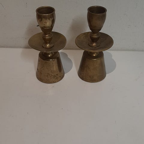 De er begge i rigtig fin stand og har blot lidt stearinrester hist og pist og trænger til en pudsning. H. 18,5 cm.