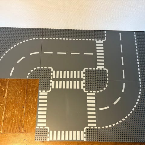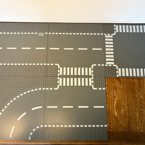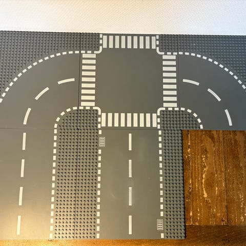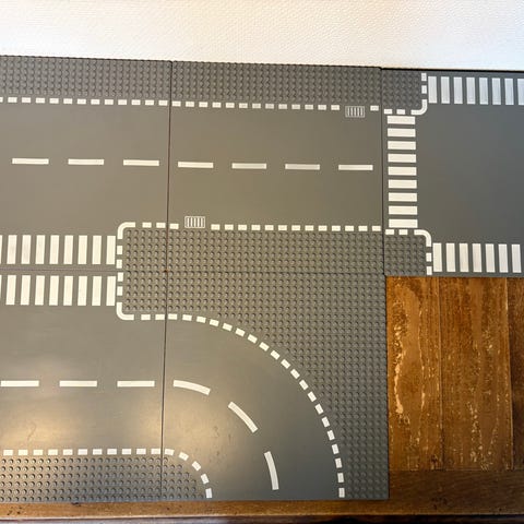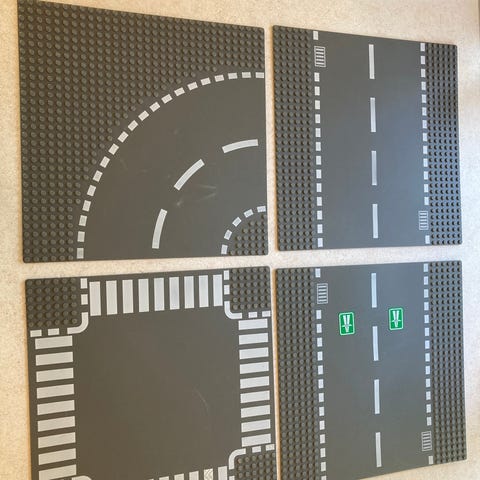 LEGO Byggeplader med vejstykker i forskellige mønstre og farver, herunder grå og grønne sektioner. Pladerne er designet til at kunne sammensættes og skabe veje til LEGO-konstruktioner. Materialet er plastik, og de er velegnede til børn til leg og bygning af bymiljøer.