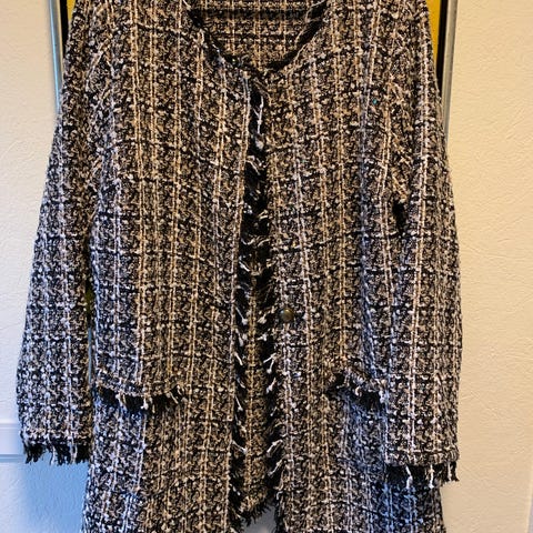 San Antonio jakke i mørkebrun farve, designet til kvinder i størrelse 46 med et brystmål på cirka 104 cm og en længde på cirka 58 cm. Bemærk at jakken er længere fortil end bagtil. Jakken har et mønstret stof med tekstdetaljer i lysere brun og en åben front med draperede kanter. Jakken er fremstillet af 80% polyester og 20% viskose medens draperingerne er i jersey, foret er fremstillet af 100% polyester satin. Blusen medfølger ikke.