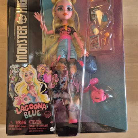 Monster High Lagoona Blue dukke med en højde på ca. 27 cm. Dukken har grøn hud, blågrønt hår og er iført en lilla kjole med mønster. Dukken har led i arme og ben, hvilket muliggør forskellige positioner.