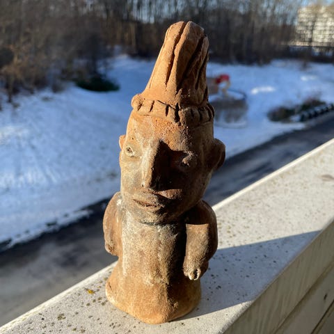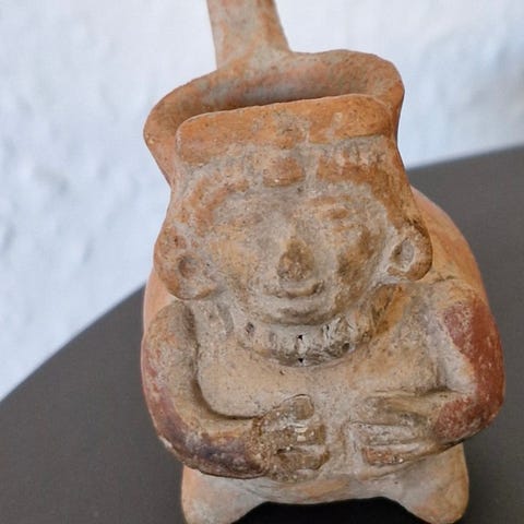 Mexicansk skulptur, Jalisco Bichrome Pottery Kneeling Female Figure, ca 40 cm høj.