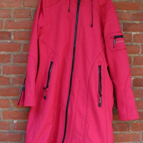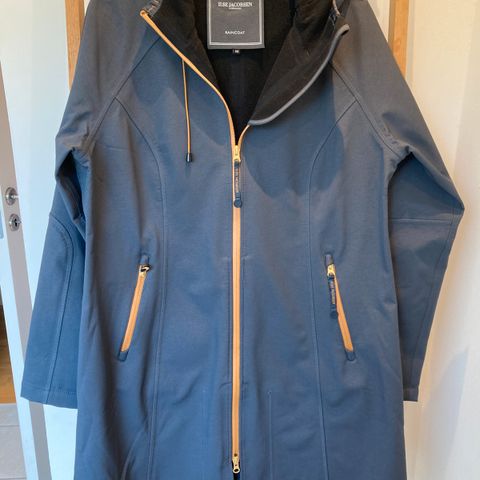 Mørkeblå softshell jakke / frakke med hætte, lommer i siderne. Jakken er brugt i en kort periode. God stand.