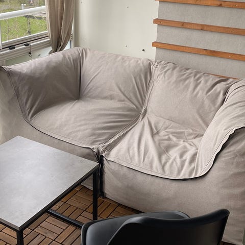 Saba sækkemøbler bestående af to stole og to puffer i sandfarvet stof. Købt i havemøbelland til 9000 kr. ca 2 år gamle. Med skum til brug på terrassen, altanen eller græsplænen. Hjørnemodulerne kan lynes sammen til en sofa. Stoffet er i sandfarvet Olefin, som bl.a. har disse fordele: styrke, farveægthed, komfort, modstandsdygtighed over for pletter, meldug, slid og sollys.