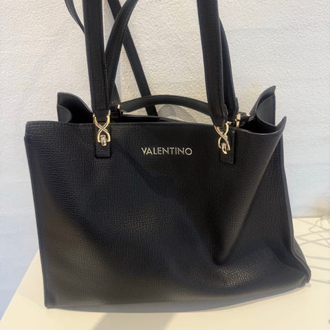 Smuk og elegant Valentino taske i sort med guld detaljer. Tasken er rummelig og perfekt både til hverdag og arbejde. Den kan bæres i hånden med de to hanke eller som skuldertaske/crossbody med den aftagelige og justerbare rem.