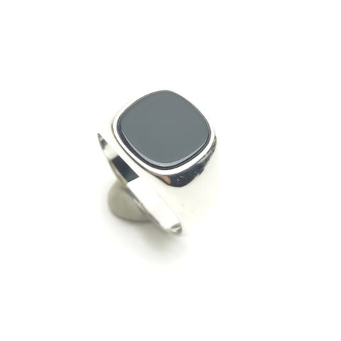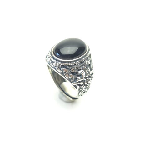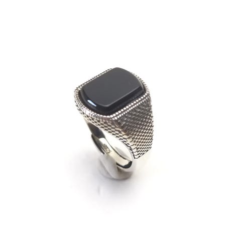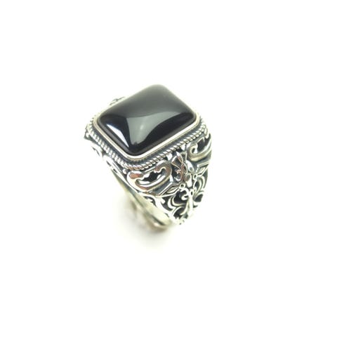 Stor og kraftig sterling sølv herrering stemplet 925. Ringen er dekoreret med en stor onyx sten og udskæring påbegge sider delvist oxyderet. Udsmykning måler 19 x 15 mm og vejer 15 gram. Ringen fåes i 3 forskældelige størrelser 57, 60 og 62. De er ubrugte.