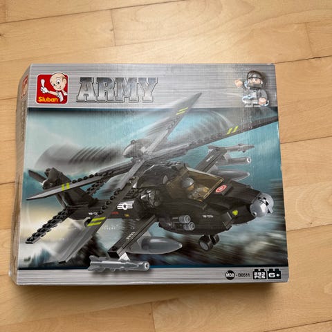 Cobi Army Militærhelikopter Byggesæt i plastik. Sættet indeholder dele til at bygge en helikopter i kamuflagefarver samt tilhørende figurer. Velegnet til børn og samlere, der ønsker at bygge og lege med militært tema.