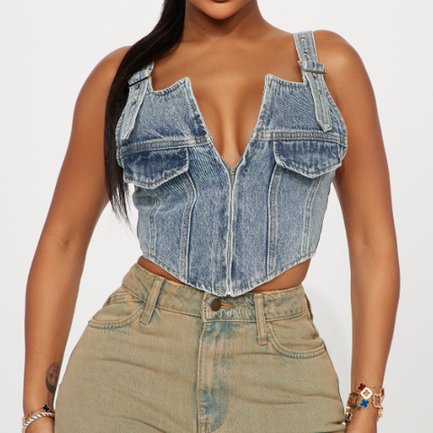 Blå denim top med åben ryg og knapper foran