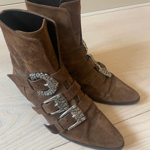 Sko med ca. 8 cm hæl. Ingen brugsspor på skindet. Det kan ses på lædersålen, at der er gået i skoen.