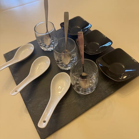 Design Letters Tapas Sæt bestående af en træplade med skiferindsats og tre hvide keramikskåle. Sættet er designet til servering af tapas og småretter og kombinerer naturlige materialer som træ og keramik.
