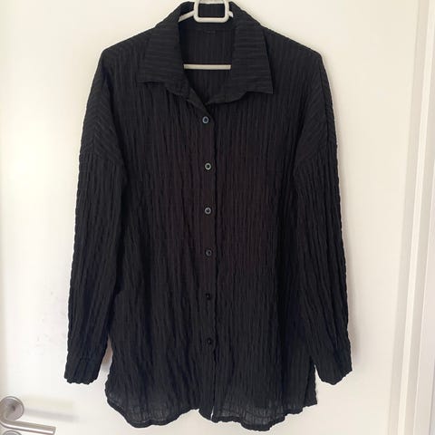 Sort skjorte fra Tippy str m/xl blonde for oven uden ærmer. Små dutter som mønster hele vejen ned. Længde fra skulder og ned ca 70 cm. Fra ærmegab til ærmegab ca 47 cm. Aldrig brugt. Kan evt sendes i henhold til gls takster.