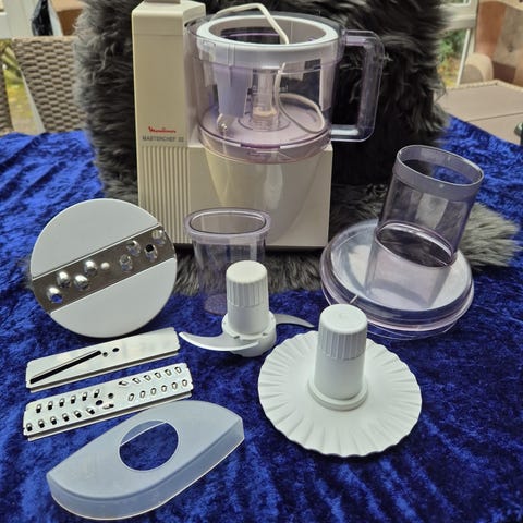 Moulinex Fresh Express+ køkkenmaskine med flere rive- og skiveindsatser i forskellige farver. Maskinen er designet til at rive og skive grøntsager og andre fødevarer. Den har en kompakt hvid og rød krop med en elektrisk motor og et tilslutningskabel. Inkluderer forskellige rive- og skiveindsatser i plastik og metal til forskellige snitstørrelser og funktioner.