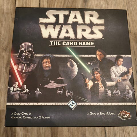 Star Wars The Card Game brætspil, der inkluderer fem kortpakker. Spillet indeholder forskellige karakterer og temaer fra Star Wars-universet.