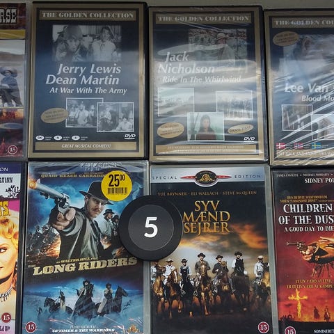 Gamle DVD film pakke indeholdende 5 western klassiske film. Filmene inkluderer titler som 'Ride In The Whirlwind' med Jack Nicholson, 'Long Riders', 'Syv Mænd Sejrer', 'Heller In Pink Tights' med Sophia Loren og Anthony Quinn samt 'Children of the Dust'. DVD'erne er i original emballage med dansk tekst.