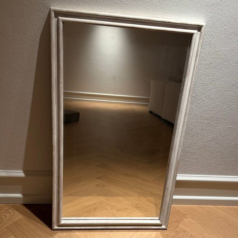 Gammel veteranbil i den ene side. Spejlet har patina men er ikke i stykker. Et par sorte små streger i øverste kant. Rammen har lidt afskalninger.