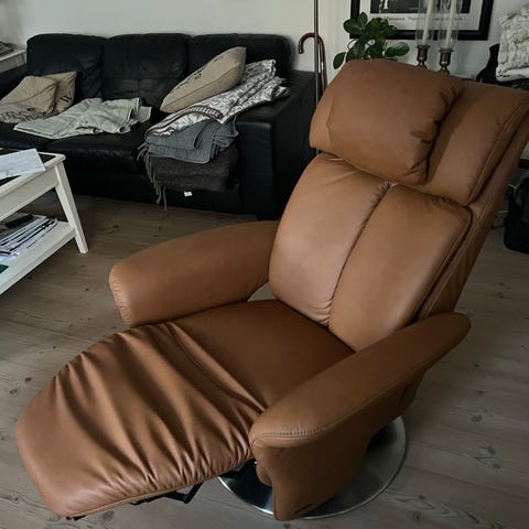 Rigtig fin lænestol som har mange muligheder, kan hejse en op så man næsten står op så det er nemt at komme ud af stolen. Den er marts måned så brugt meget lidt, da ejeren blev sengeliggende.