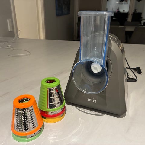 Witt multifunktionel grøntsagsskræller med fem udskiftelige tromler i forskellige farver til skæring, rivning og snitning af grøntsager. Enheden er designet til nem montering og brug, egnet til forskellige typer grøntsager som gulerødder og agurker. Materialet er robust plast og metal, og apparatet er velegnet til husholdningsbrug.