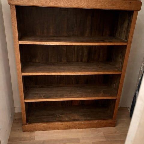 Gammel retroreol i lyst fineret birketræ. Muligvis svensk oprindelse. Fire låger og otte justerbar hylder. Med sort sokkel, som nemt kan skrues af. Højde 190 cm. Bredde 142 cm. Dybde 22 cm. Reol, bogreol mv.