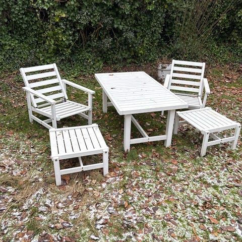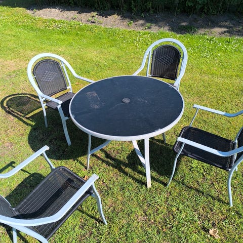 Udendørs havemøbelsæt bestående af sofa, en stol, to fodskamler og et sofabord. Møblerne har en hvid polstret pude og en hvidmalet aluminiumsramme. Sættet er designet til udendørs brug og egner sig til terrasse eller have. Trænger til rengøring. Nypris 15000kr