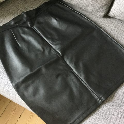Fin sort skindnederdel fra Wardrobe Cph med hvide galoner, forlommer, slids og lynlås bagpå. Den måler 45 cm. og med tags