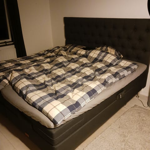 Man kan få boksmadrassen og en topmadras med. Topmadrassen har kun været brugt i nogle måneder. Betrækket på begge dele kan tages af og vaskes.