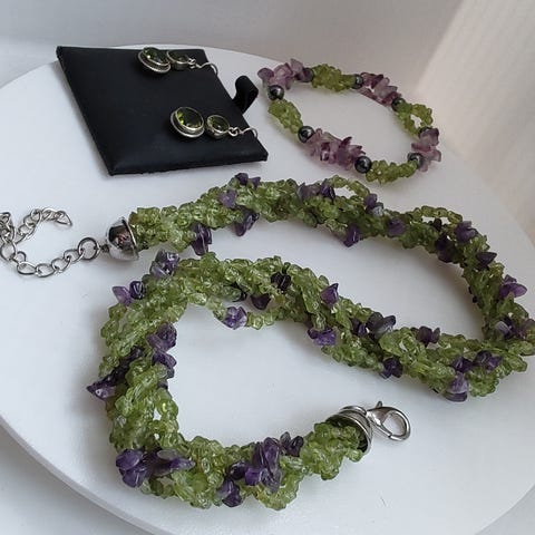 Komplet peridot ædelstens smykkesæt bestående af halskæde, armbånd og ørestikkere. Fyldt med store flotte peridoter af god kvalitet.
