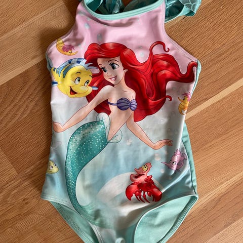 Disney Minnie Mouse badedragt med lange ærmer i lyserød farve. Badedragten er designet til børn og har en lynlås på ryggen for nem påklædning. Materialet er egnet til svømning og vandsport.