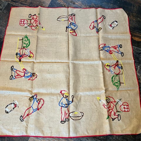 Lille Broderet ophæng til jul / nisser spiser risengrød, måler 23 x 19 cm