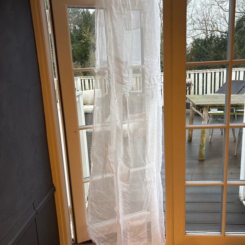 Et sæt italienske gardiner med skønt mønster. Flødefarvet bund med rødt, grønt og brunt mønster. Fra 50erne. Kan fint bruges som duge.