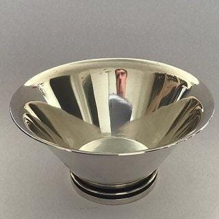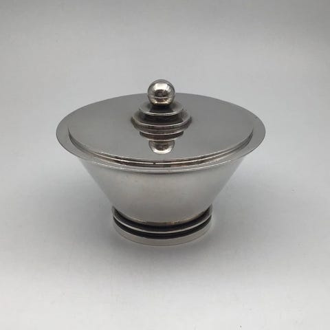 Georg Jensen Sterling Sølv Pyramide Sukkershaker / Strøbøsse No. 645 Med stempler 1955. Engelsk import og dato stempler. Designet af Harald Nielsen (1892 - 1977) Harald Nielsen var lillebror til Georg Jensens tredje kone, Johanne. Han ville være maler, men blev trukket ind i Georg Jensens sølvsmedje, hvor han startede som lærling i 1909. Derfra arbejdede han sig op som designer/direktør for smedjelærlingeskolen. I 1954 blev han smedjedirektør og i 1958, blev han kunstnerisk leder, en stilling an besad indtil 1962. Nielsens rolle som lærlingeskoleleder var særlig vigtig efter Jensens død i 1935, da Nielsen sikrede den forsatte høje kvalitet af firmaets design og produktion, ved at rekruttere dygtige unge sølvsmedje og designere, samt uddanne dem efter Georg Jensen Sølvsmedjens høje standarter.