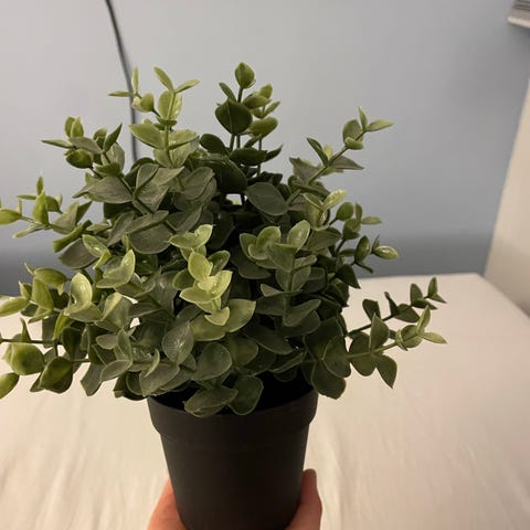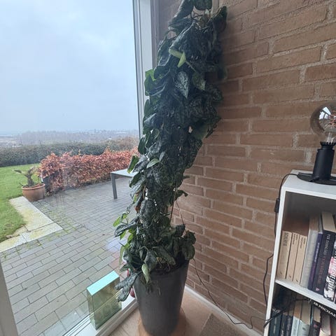 Sølvblad i beton-krukke. Den er stedsegrøn, og står flot med sine matte, grønne blade. Ift. størrelsesforhold står den på billederne på 60*60-fliser (krukken er dermed nok ca. 45*45, og planten har en flot størrelse).