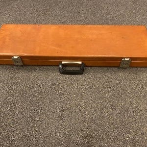 En ældre variation. Mål: 124x34x11. Ingen låsefunktion, men der er 2 elastikker til at fæstne kufferten. Spænderne er lidt løse.